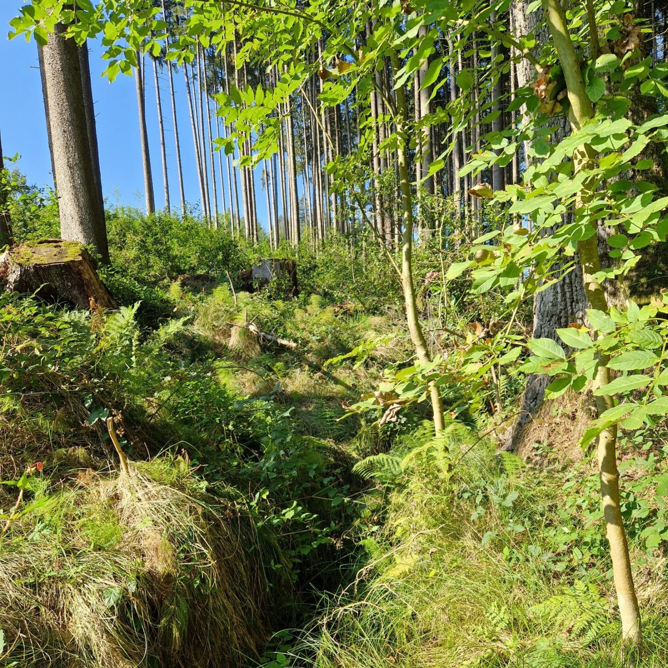 Deshalb setzen wir gezielt auf den Aufbau artenreicher Mischwälder. Durch die Pflanzung und Förderung standortgerechter Baumarten wie Buche, Eiche, Linde, Tanne, Wildkirsche oder Ahorn schaffen wir eine vielfältige Waldstruktur. Diese Baumarten entwickeln tiefere und unterschiedlich ausgeprägte Wurzelsysteme, verbessern langfristig die Bodenstruktur, erhöhen die Wasserspeicherfähigkeit der Böden und bieten Lebensraum für eine Vielzahl von Tier- und Pflanzenarten. Schritt für Schritt entsteht so ein stabiler, gesunder Grundbestand.